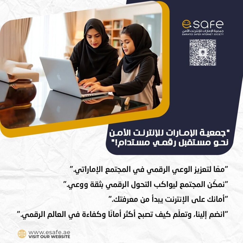 “معًا نحو تعزيز الوعي الرقمي وبناء مستقبل آمن وكفء في العالم الرقمي! 🌐✨جمعية الإمارات للإنترنت الآمن تسعى لتثقيف وتمكين المجتمع الإماراتي لتحقيق تحول رقمي واعٍ وآمن. ابدأ من معرفتك، واحرص على أن تكون جزءًا من رحلة التحول الرقمي لبناء بيئة أكثر أمانًا على الإنترنت.كن جزءًا من التغيير وتعلم كيف تصبح أكثر وعيًا وثقة في العالم الرقمي!