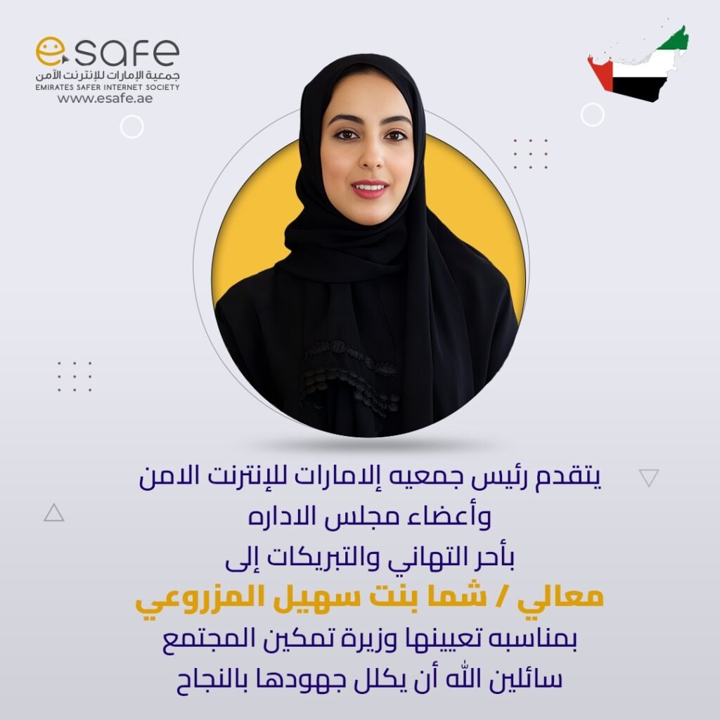 يتقدم رئيس جمعية الامارات للإنترنت الأمنوأعضاء مجلس الإدارةبأحر التهاني والتبريكات اليمعالي شما بنت سهيل المزروعي