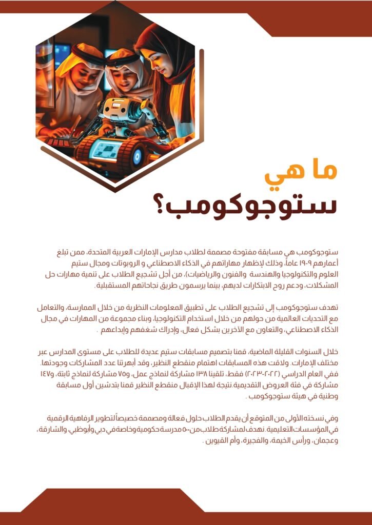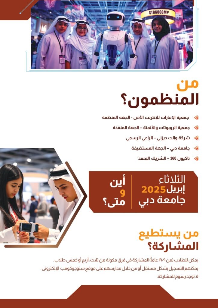 جمعية الإمارات للأنترنت تتساءل عن أول مسابقة للذكاء الصناعي والروبوتات في الإمارات لطلاب المدارس من عمر 9 إلى 19. في الدورة الأولى سيوف يعمل المتدرب على تقديم حلول فعالة مخصصة لتحسين رفاهية الأطفال في المؤسسات التعليمية. مسابقة ستوجوكومب تُلهم للابتكار وثير الإبداع وتغذي الفضول حيث يقوم المتدربون بتوسيع مهاراتهم في العلوم والتكنلوجيا والهندسة والرياضيات والفنون (STEAM) لمنعم في الذكاء الاصطناعي والروبوتات.#مستقبل_الأطفال #ذكاء_اصطناعي #روبوتات #جامعة_دبي #تكنولوجيا_المستقبل #استكشاف #رفاهية_الأطفال #استكشاف_الفضاء #تعليم_الأجيال #STEM”